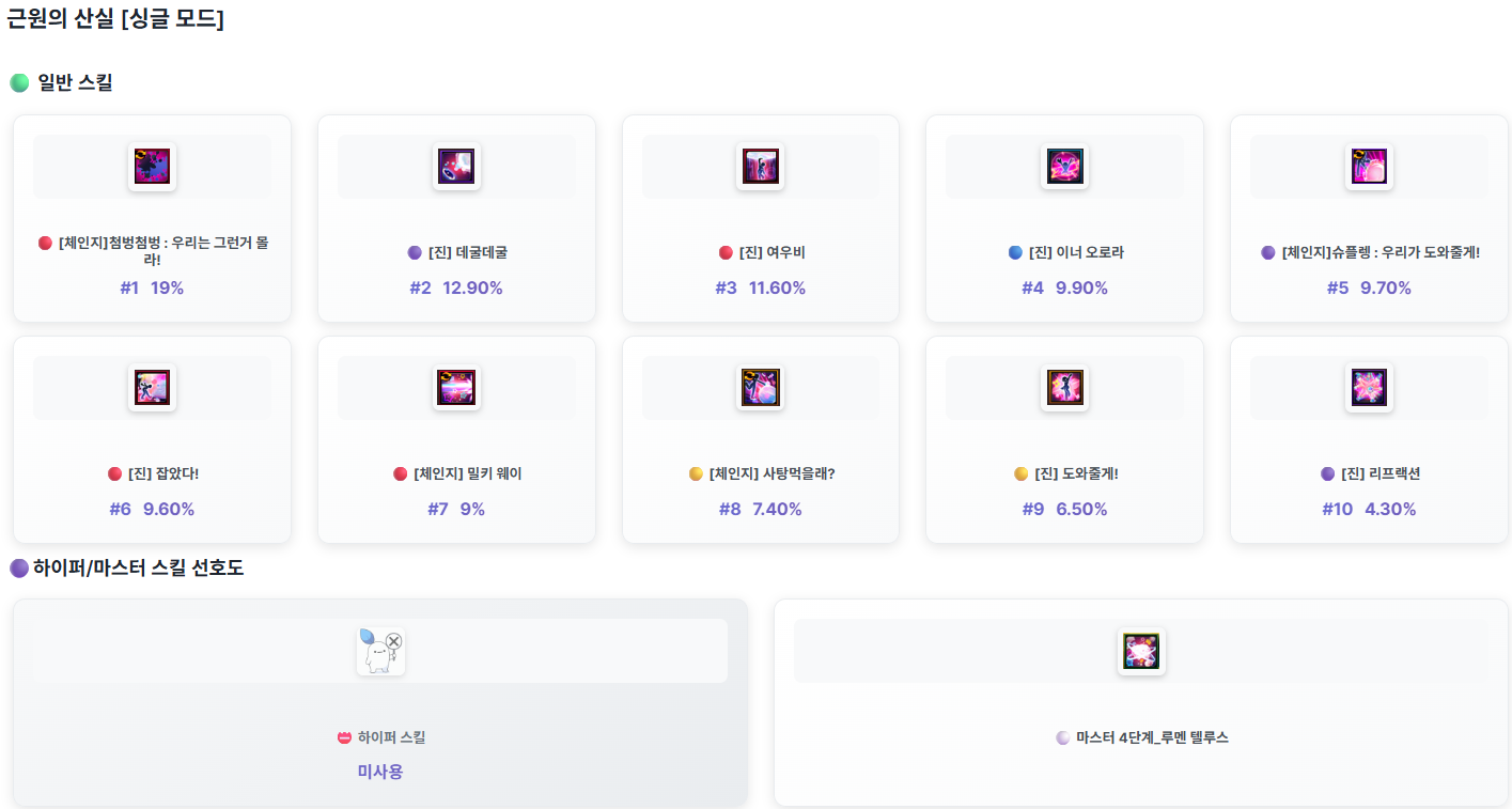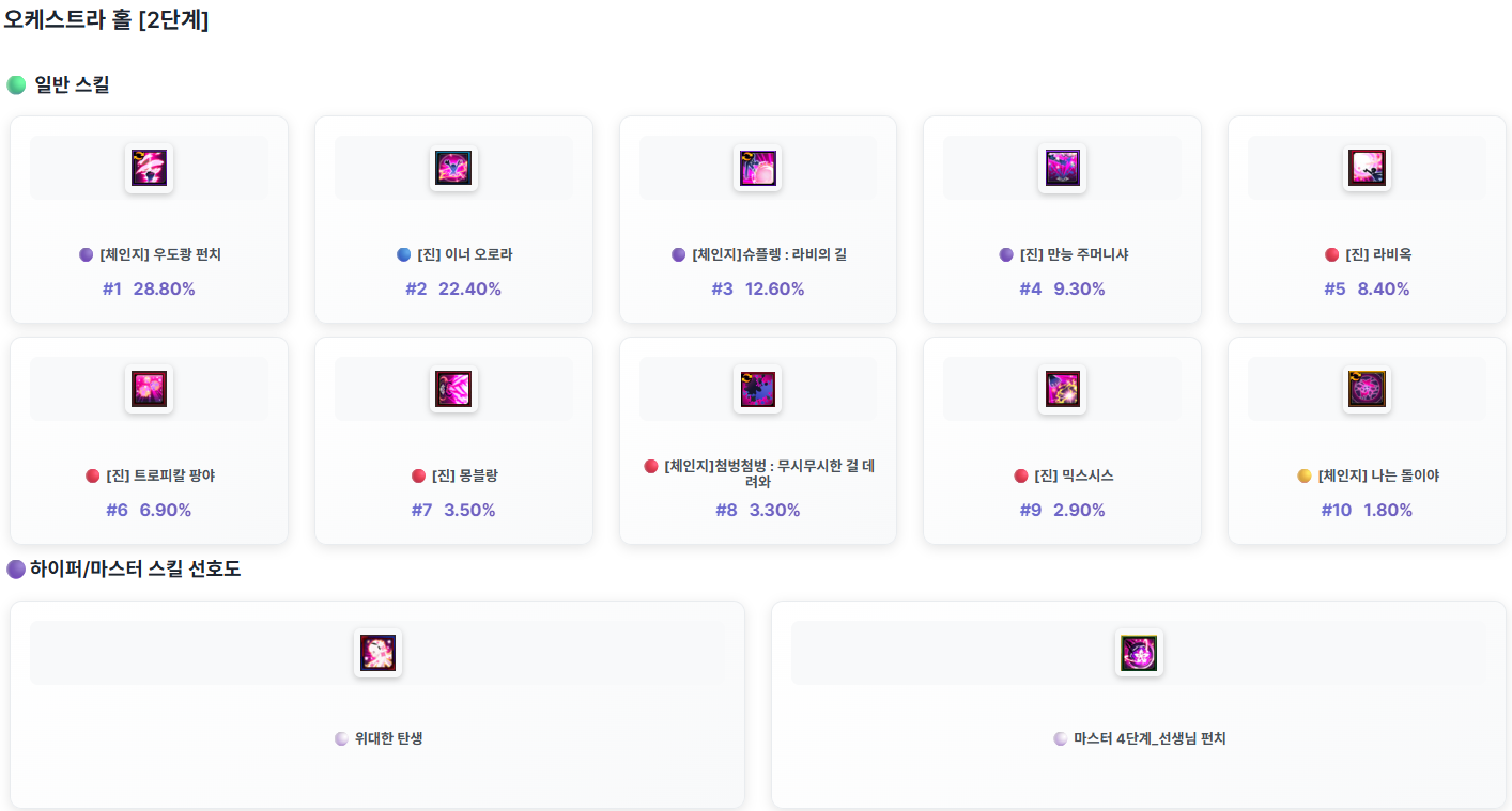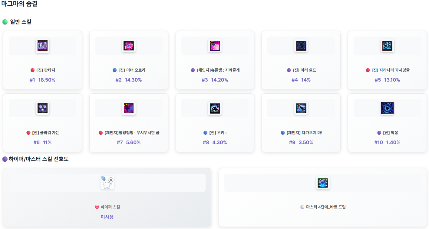 GM너구리가 던전을 클리어한 모험가님들 가운데 전투력이 높은 상위 모험가님들의 캐릭터의 스킬 사용 정보를 안내 드립니다.