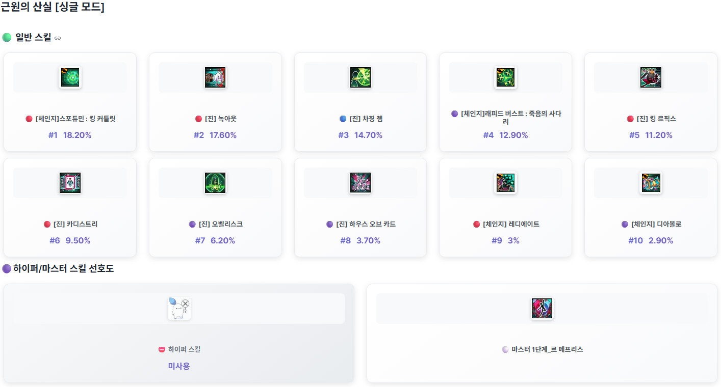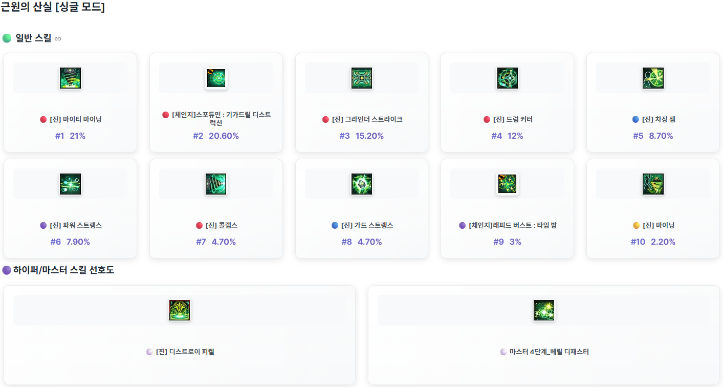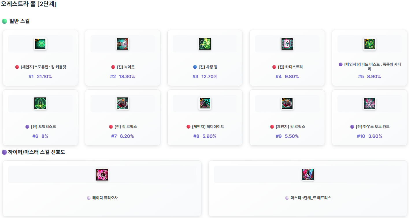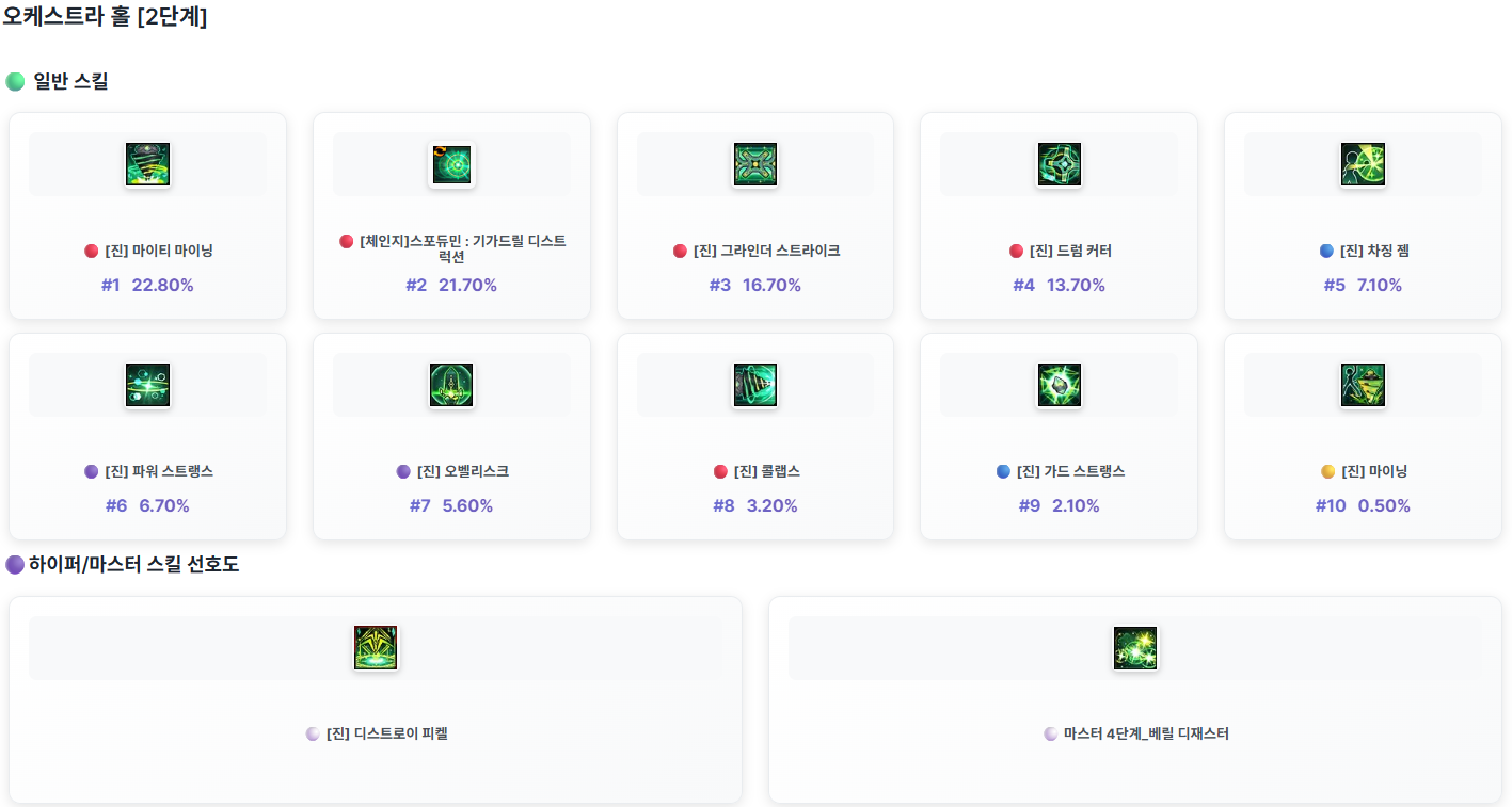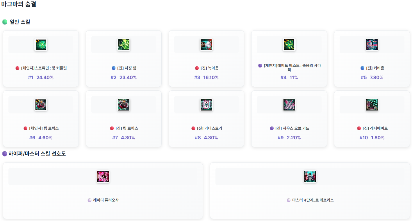 GM너구리가 던전을 클리어한 모험가님들 가운데 전투력이 높은 상위 모험가님들의 캐릭터의 스킬 사용 정보를 안내 드립니다.